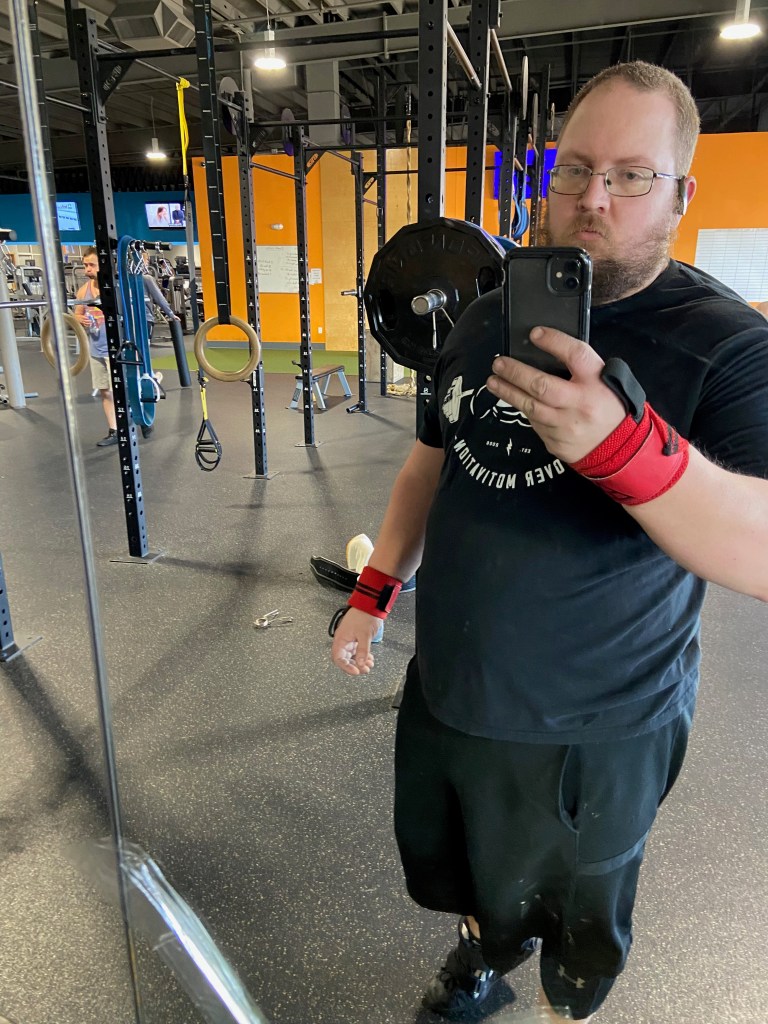 Picture taken before my lifting session earlier today really started to get going. Muscular development hasn’t been the main goal but I have felt a significant amount of it in my upper back, right where I have needed it for the 3 main lifts. I know a black t-shirt shirt, even as perfectly fitting and awesome as the Shaw Strength one I had on, doesn’t help show the development in upper back and traps but here it is nonetheless. Also seeing more development in my arms after adding that isolation day on Tuesday at the gym. For most of the 2021 I was about size 3.5 on the Evolution elbow sleeves, but now I am beginning to feel much more compression in the upper part of my arm when I wear the 4x size ones I got a full year too early.