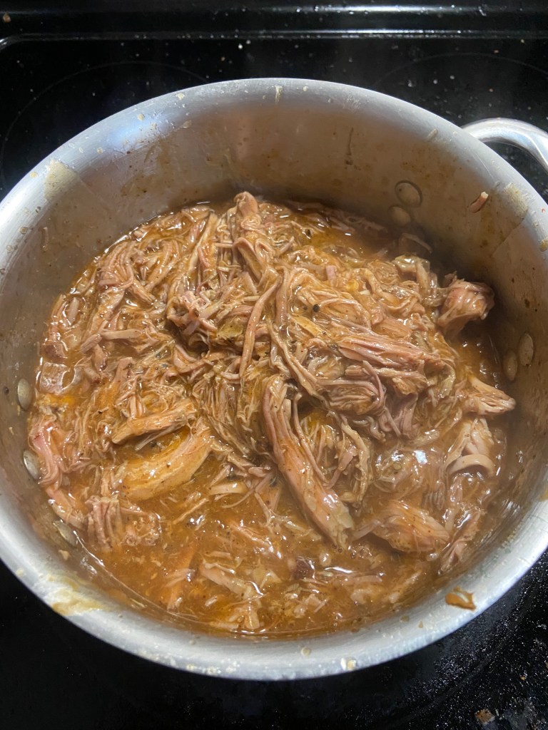 This couldn’t be easier to make. I coated the pork shoulder evenly with the kosher salt and taco seasoning. After pulling the cooked pork shoulder from the oven, I poured the remaining liquid, fat and all, through a strainer to get only the liquid. From there I tasted it to see how salty it was and added the water to dilute it. I added the honey, ketchup and mustard then whisked it together so nothing burned on the bottom of the pan. I let the pot or sauce reduce by maybe 20-25% oh high heat before adding the corn starchy slurry. It thickened up to the proper viscosity in just a few minutes and I let it fully finish to cook out the corn starch. I pulled the shoulder meat apart in long strings and put it all into the sauce and heat up on low for another few minutes until it was all heated through. A true stroganoff would include the sour cream in the sauce but the it’s fine as a garnish.