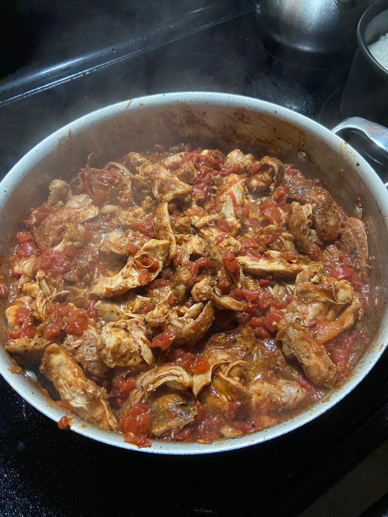 Once the final pieces of chicken are browned and set aside with the others, hopefully in a bowl to catch any liquid from them, pour in the 4 cans of tomato and Rotel. Add the taco seasoning to the tomatoes and chiles. Clean out the cans with water by pouring water into one can and transferring it to another and repeat that until all them are clean. The remaining tomato liquid and tomatoes should be in the water. Pour it in to the pan, then turn up the heat to let the tomato juice reduce till there’s almost just tomatoes and chiles in the pan. Pull the chicken in large pieces and put into the pan then stir into coat the chicken with the tomatoes and sauce. The amount of sauce that is left in the pan will tell the cook how much chicken to add to the pan. The picture has 11 boneless chicken thighs in it. I had 3 left over for the next night. Taste for seasoning, then adjust as necessary. It needed a few more good shakes of kosher salt before service.