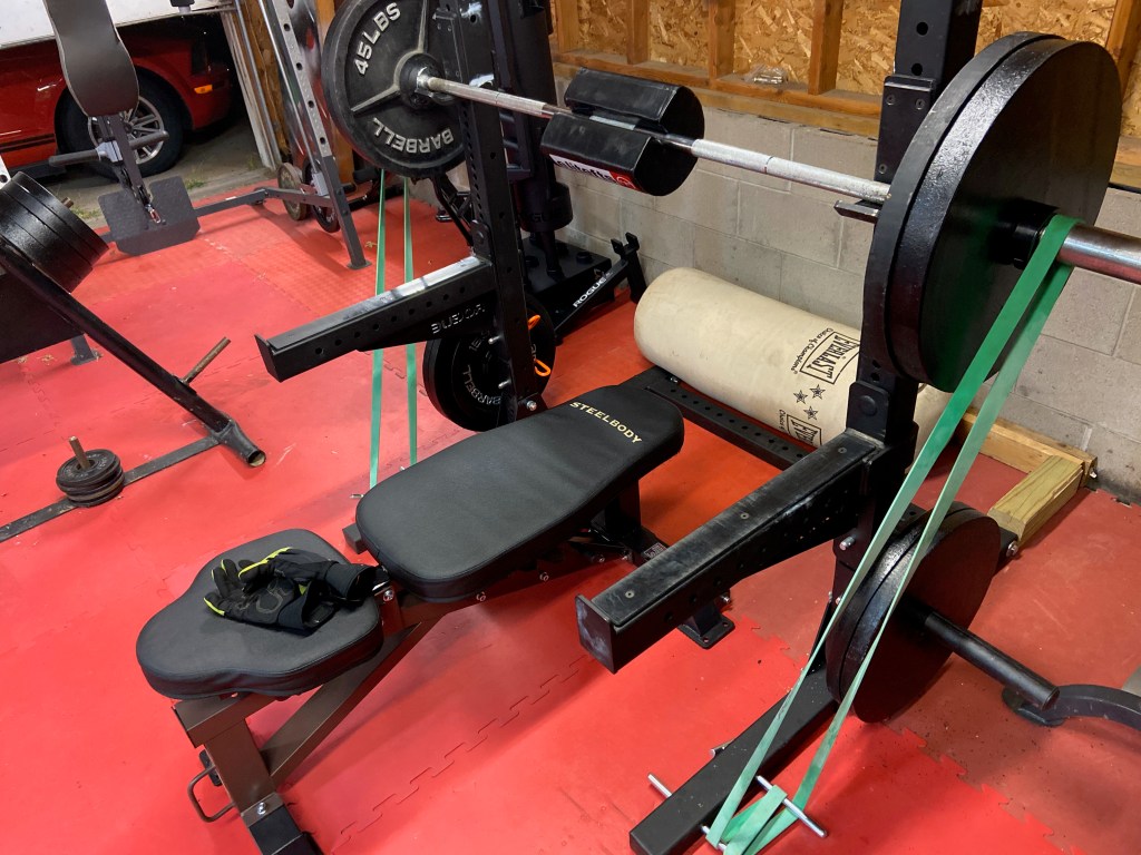 I also do more partial range of motion work than before. It is done to work more on the back portion of the lift and the lockout. First came rack pulls. I discovered the lift having watched it on Youtube and doing it when my spotter arms for my squat rack arrived. It was a lift I could load heavier than pulls from the floor because the lift started at my knees plus or minus a few inches. I started with bare weight to start but I added band tension in mid-September. I got 70 pound and 100 pound bands arrived from Rogue and found immediately the value in banded rack pulls. The added tension made lockouts hard to achieve unless max effort was given and proper form was kept up. It is one of my favorite lifts because I feel it all the way up into my lats. I recognize now where they belong in the week’s layout of lifts. I now employ them when I do chest, as that is when I do lat work. They are probably the dominant reason why I feel a lot stability in my upper back. When I turned my squat rack into a power rack in mid-October, I used safety straps I bought at the same time I got the equipment to turn the former into the latter. Those safety straps allowed me to really pull a lot of weight without damaging the safety pins that came with my power rack. Second, July 2021 saw the arrival of deadlift mats from EliteFTS. They were 3/4 inch thick rubberized mats that allow me to perform block pulls. I probably will be getting more in the future, because they make doing heavy hamstring work easier. I use 4 on each side to raise the barbell off of the floor an extra 3 inches from the normal 9, the distance from the bar to the floor when loaded with 45 pound plates. The difference between the rack pulls I was doing from the straps and the block pulls from the pads was immediate. The starting position difference of the bar was about 3-4 inches lower than the rack pull. That made it a harder lift and involved my legs a lot more. Rack pulls have their place, especially when banded, but they are not even remotely the same lift.